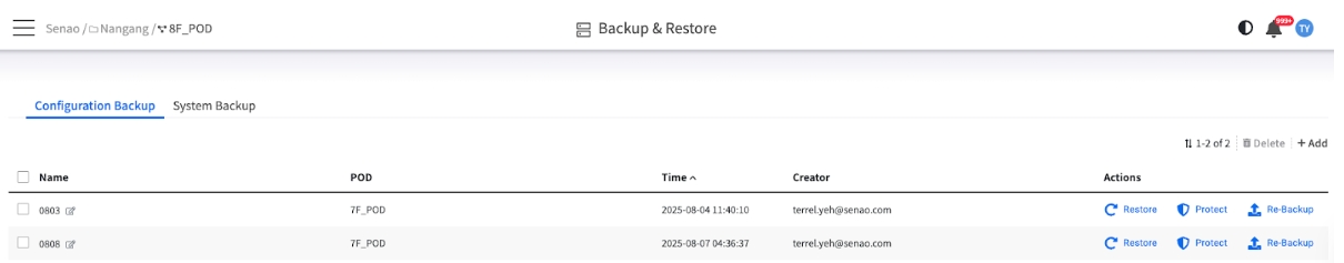 This feature allows you to create snapshots of the configurations for all nodes within a selected POD. It is an invaluable tool for change management and recovering from operational errors.