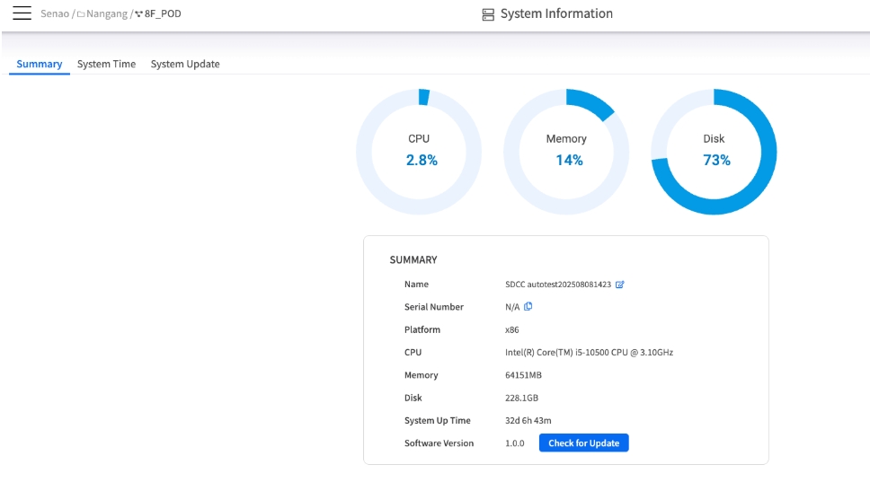 The System → System Information page is the central administrative dashboard for the EDCC platform itself, not the nodes it manages. Think of it as the control panel for the "engine room"—the underlying host system where the EDCC Docker container is running.