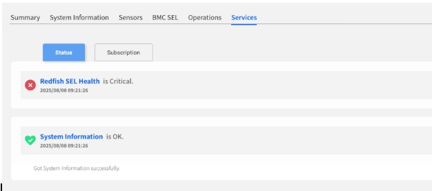 This list shows the real-time health of the core Redfish services. A failure here could explain why other data (like sensor readings) might not be appearing correctly in other tabs.