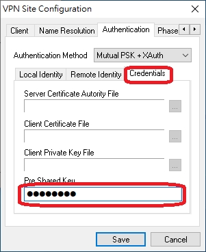 f. Authentication>Credentials input IPsec Pre-share key and click Save button.