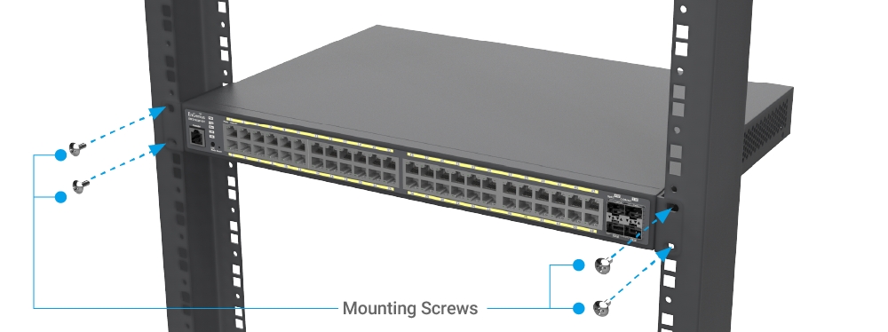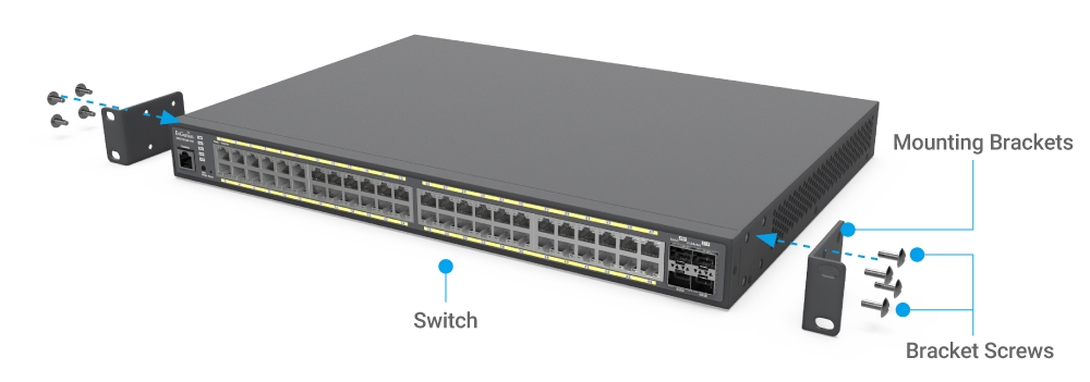 2. Secure the Mounting Brackets to the rack using the Mounting Screws.
