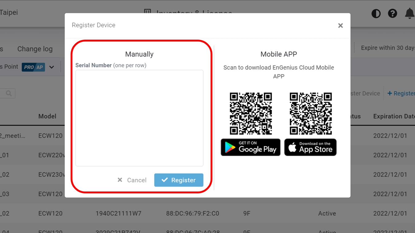 Enter the Serial Number of the device(s) for device registration. Please refer to "User Manual-Registering Devices to Organization".