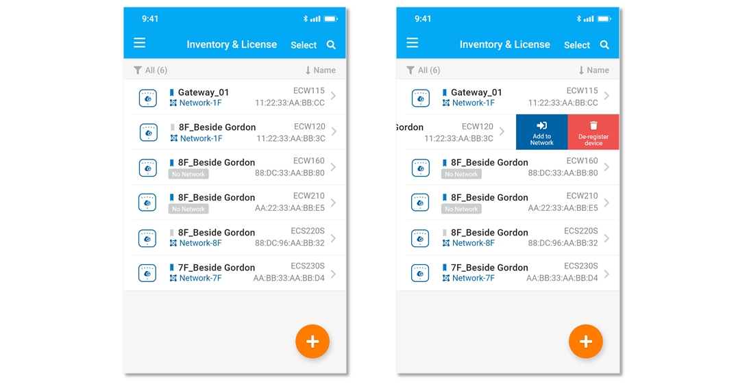 4. Registered devices will be shown on the Inventory&License page. Slide left the device and click "Add to Network" add the device to your personalized Network.