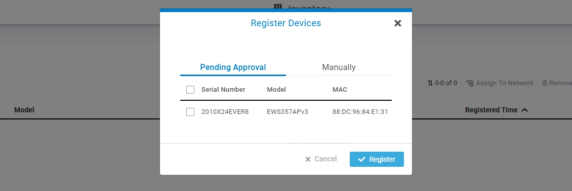 FitController will list all EnGenius Fit devices discovered from the same L2 network in the Pending Approval section. Select the device and Click "Register" to add to inventory.