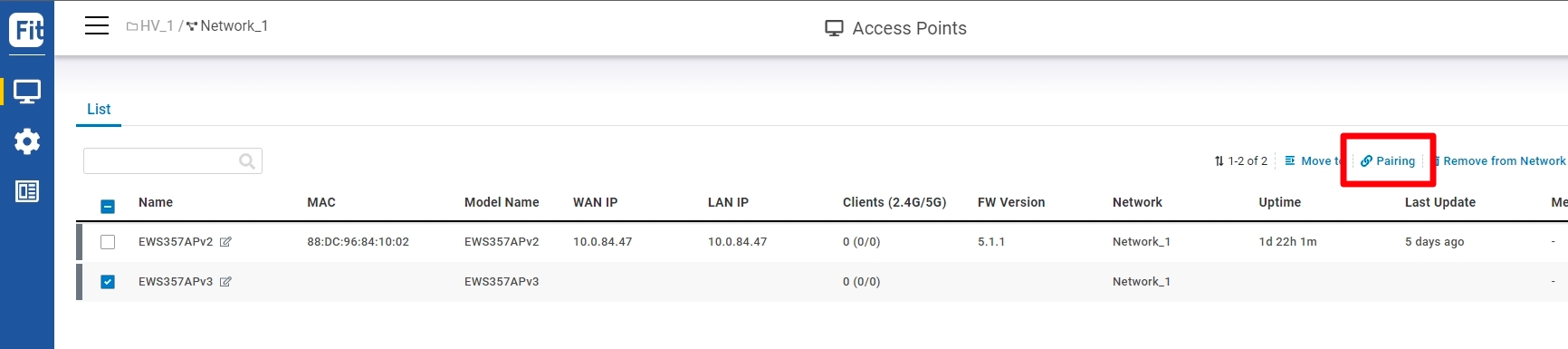 Select the newly added device and click "Pairing" to adopt the access point to build an encrypted connection between the device and FitController.