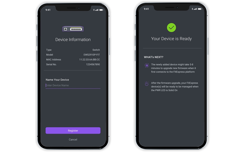 When the switch is connected to the FitXpress platform for the first time, it will automatically check the latest available firmware. If the firmware upgrade is required, it might take 8~10 minutes to complete the process.