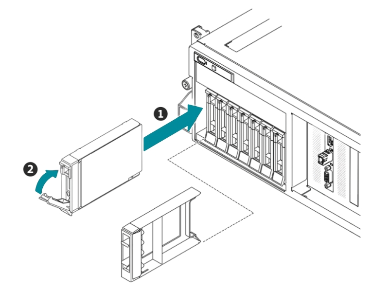 Insert the drive carrier. With the carrier latch open, align the carrier with the guide rails in the empty bay and slide it in gently until the carrier makes contact with the backplane.