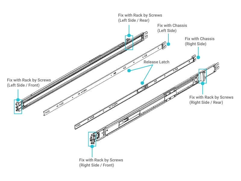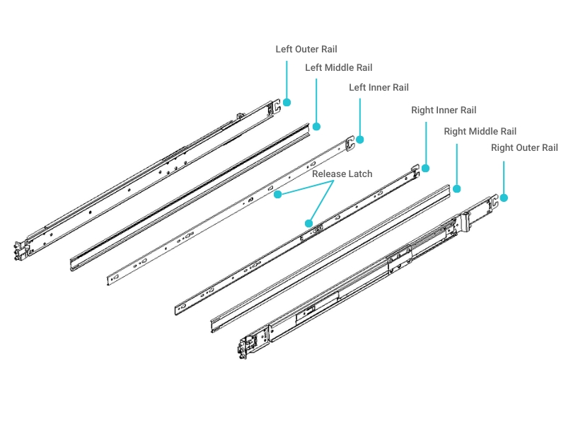 Each rail assembly consists of two main sections: an outer rail that mounts to the rack and an inner rail that stays attached to the server chassis.