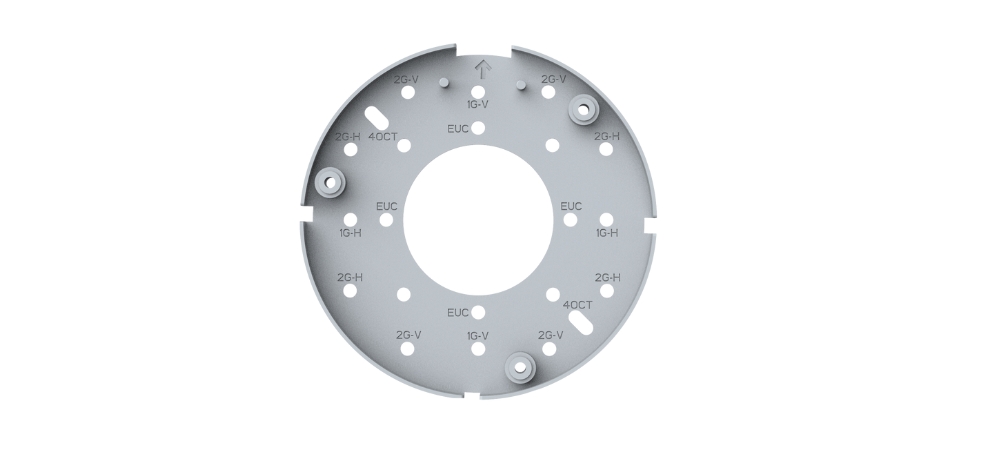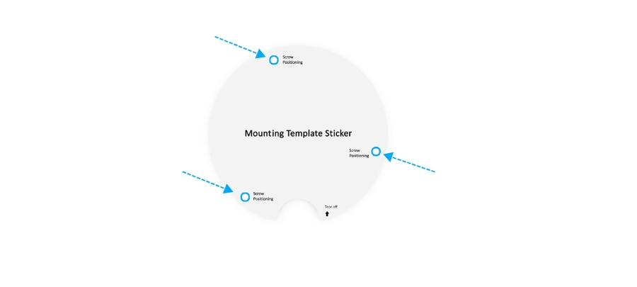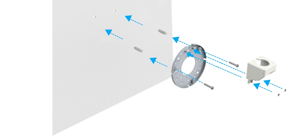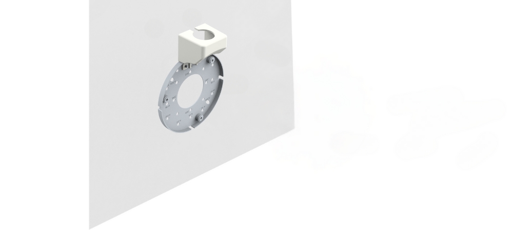 マウントプレートを配置 マウントプレートを天井または壁に配置し、対向する任意の穴またはスロットを使用して、穴を開ける位置をマーキングしてください。設置時には、カメラの向きとケーブルの出口位置を考慮してください。向きや取り付け穴の詳細については、「取り付け用テンプレート詳細」セクションの図を参照してください。