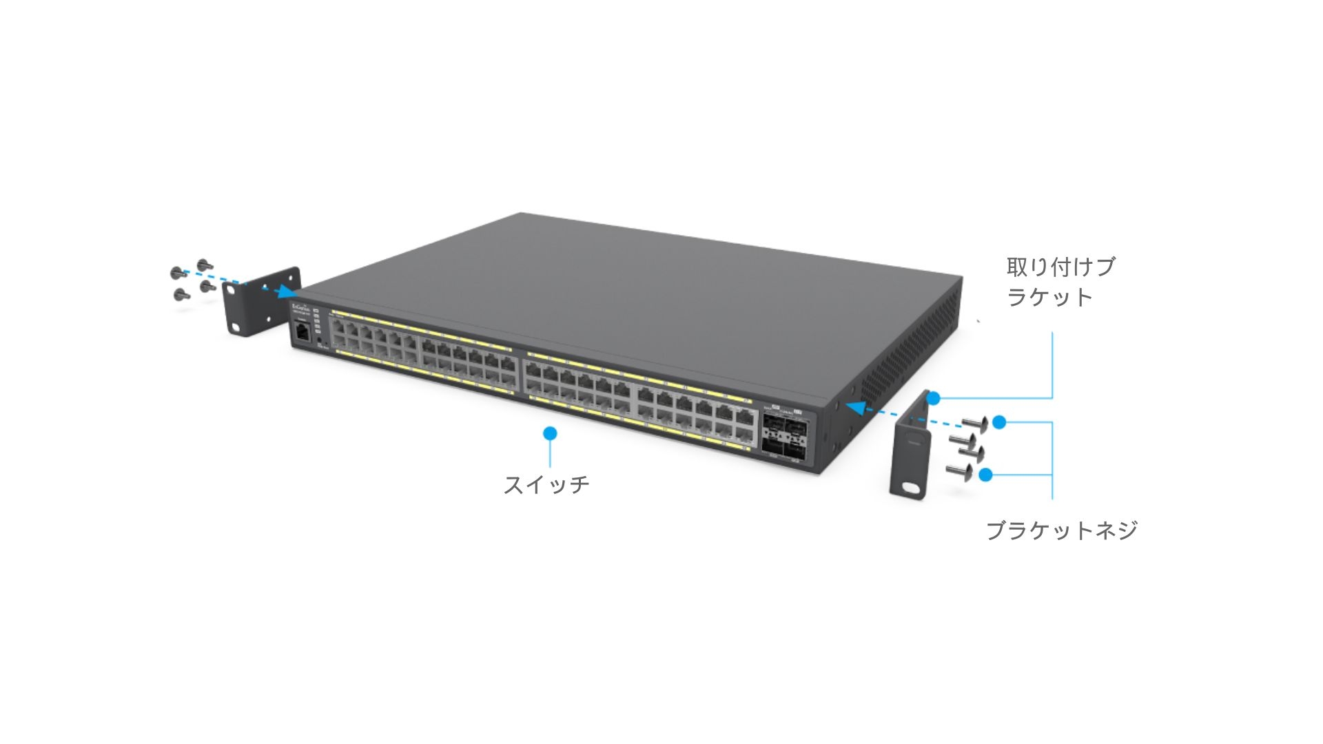 2. ラックに取り付けブラケットを取り付け、 取り付け用ネジを使用して固定します。