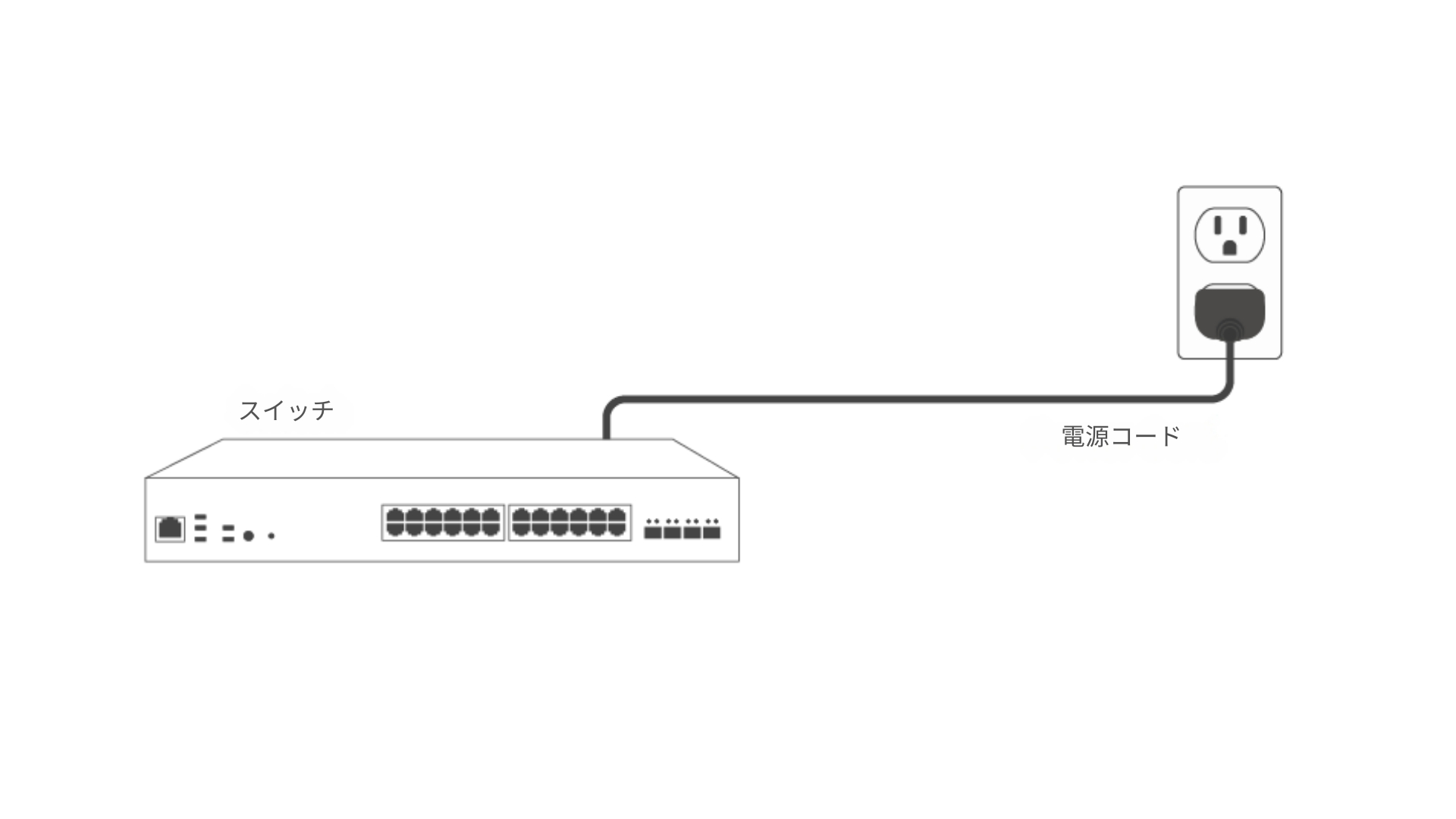 スイッチの背面に電源コードを接続し、その後電源コードを電源コンセントに差し込んでください。