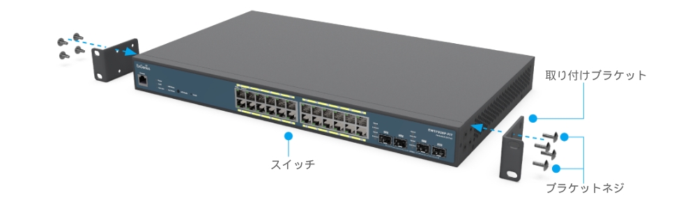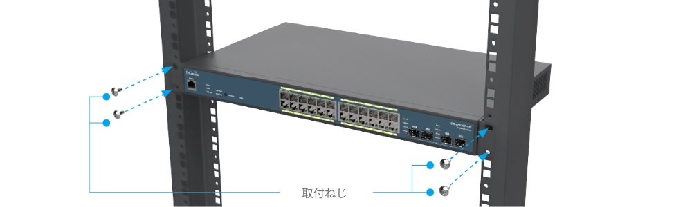 ECS2528FPはラックに取り付けることができます。取り付けるための手順を実行してください: