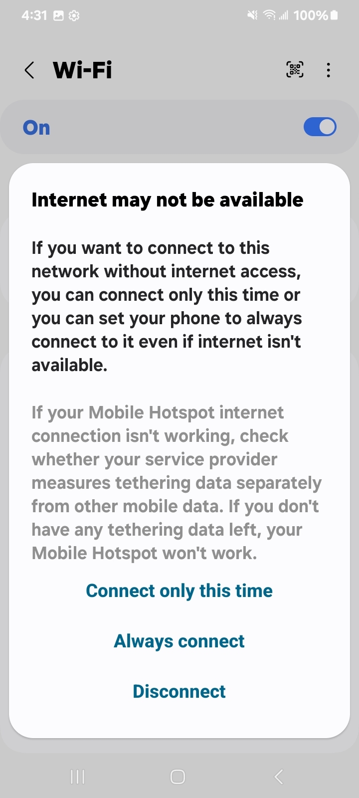 7. If you see a pop-up window on your mobile device, please click on "Connect only this time".