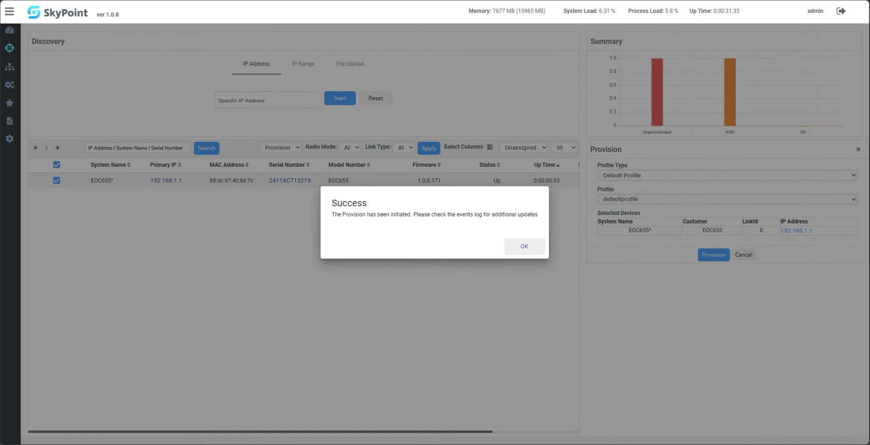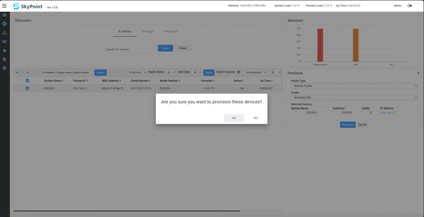 4. Once the device is discovered, the next steps are to select 'Provision,' choose the device, click 'Apply' to provision the device, and then click 'Provision' to confirm your intention to provision these devices.
