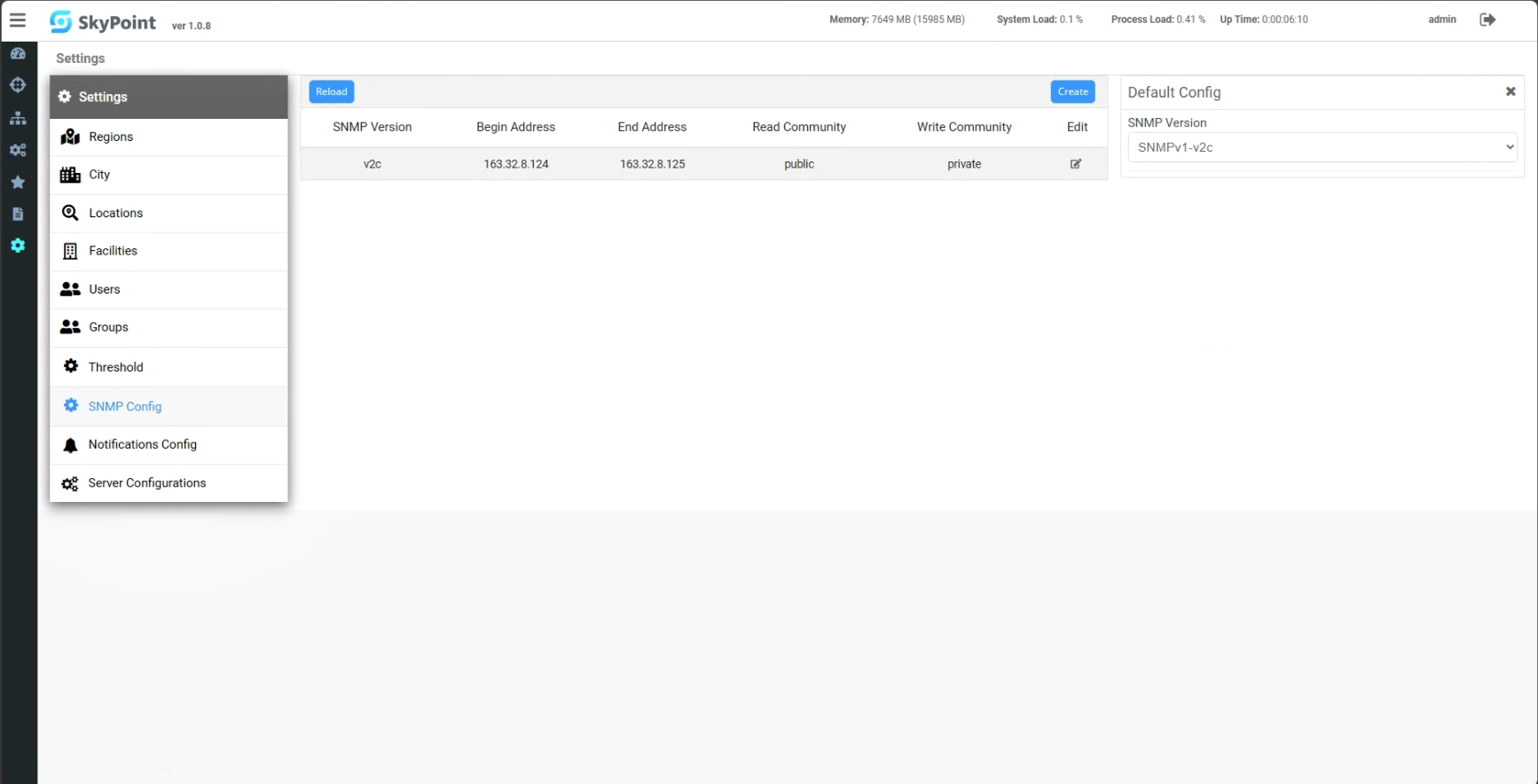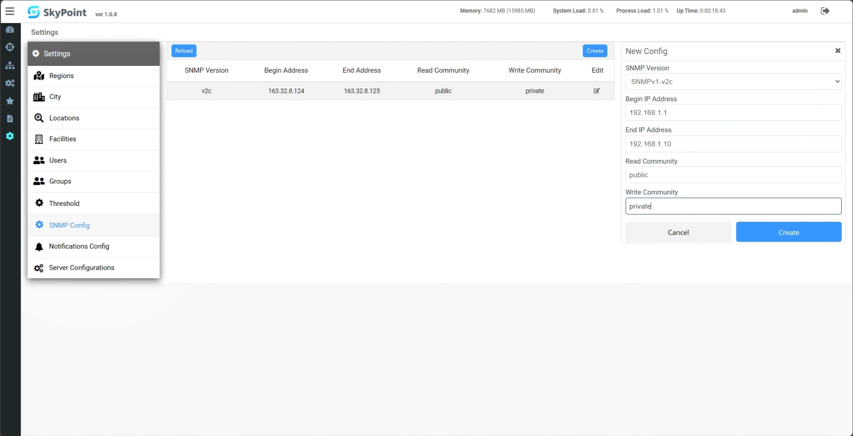 2. On the SNMP Config page, click 'Create' to configure SNMP. Then, select SNMP Version and enter the Begin IP Address, End IP Address, Read Community, and Write Community. Finally, click on 'Create' to complete the configuration. *The default Read Community and Write Community on EOC devices are public/private.