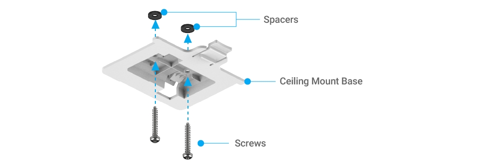 Screw the included Screws into the Ceiling Mount Base with Spacers, and the Screws unto the surface until they are flush with the surface.