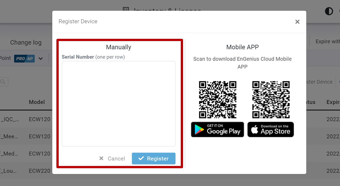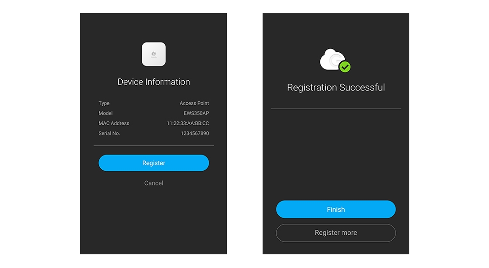 You can register the device either by Cloud To-Go mobile app or the EnGenius Cloud platform.