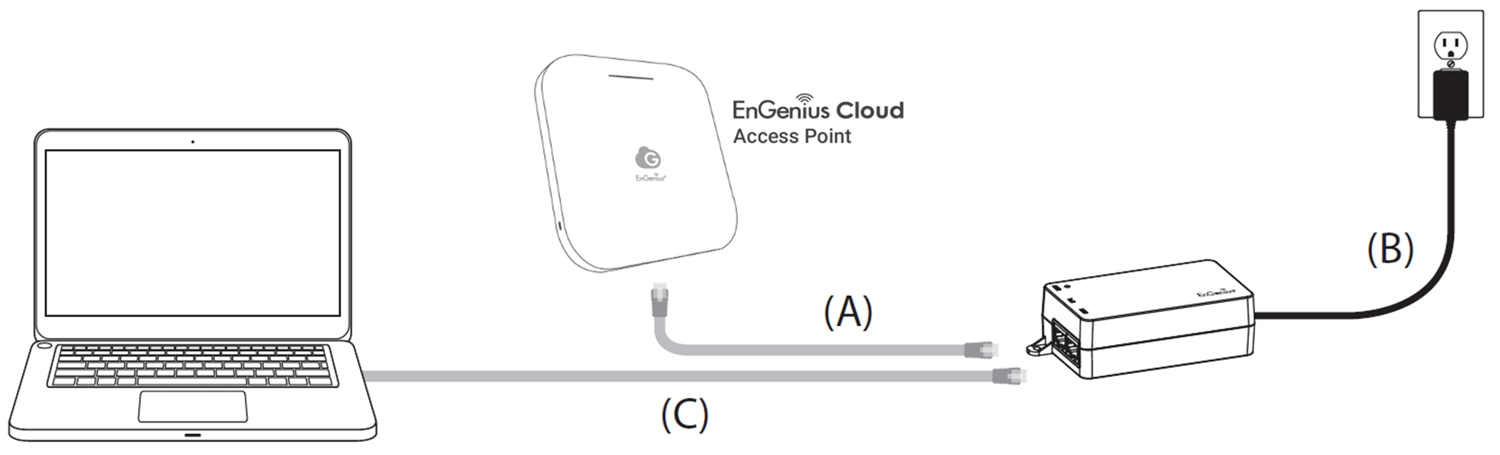 (A) Connect one end of the Ethernet cable into the LAN (PoE) port of EnGenius Cloud AP and the other end to the PoE port on the PoE Adapter.