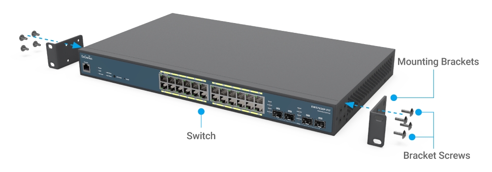 2. Secure the Mounting Brackets to the rack using the Mounting Screws.